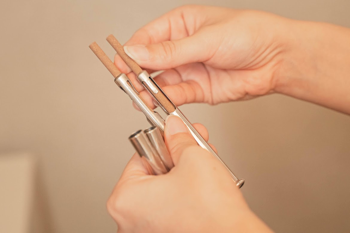 数種類の薬草で作られた温熱材に火をつけ、炎を消して棒状の専用の器具にセットします。